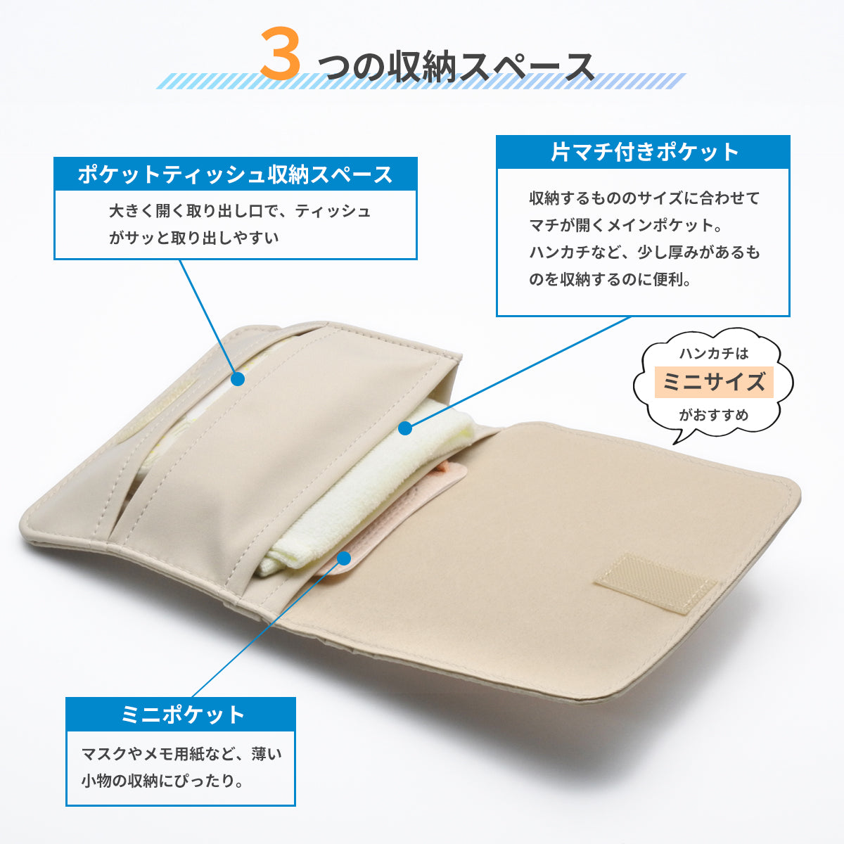 ポケットティッシュ専用スペースに加えて、2つのマルチ収納スペース付き。