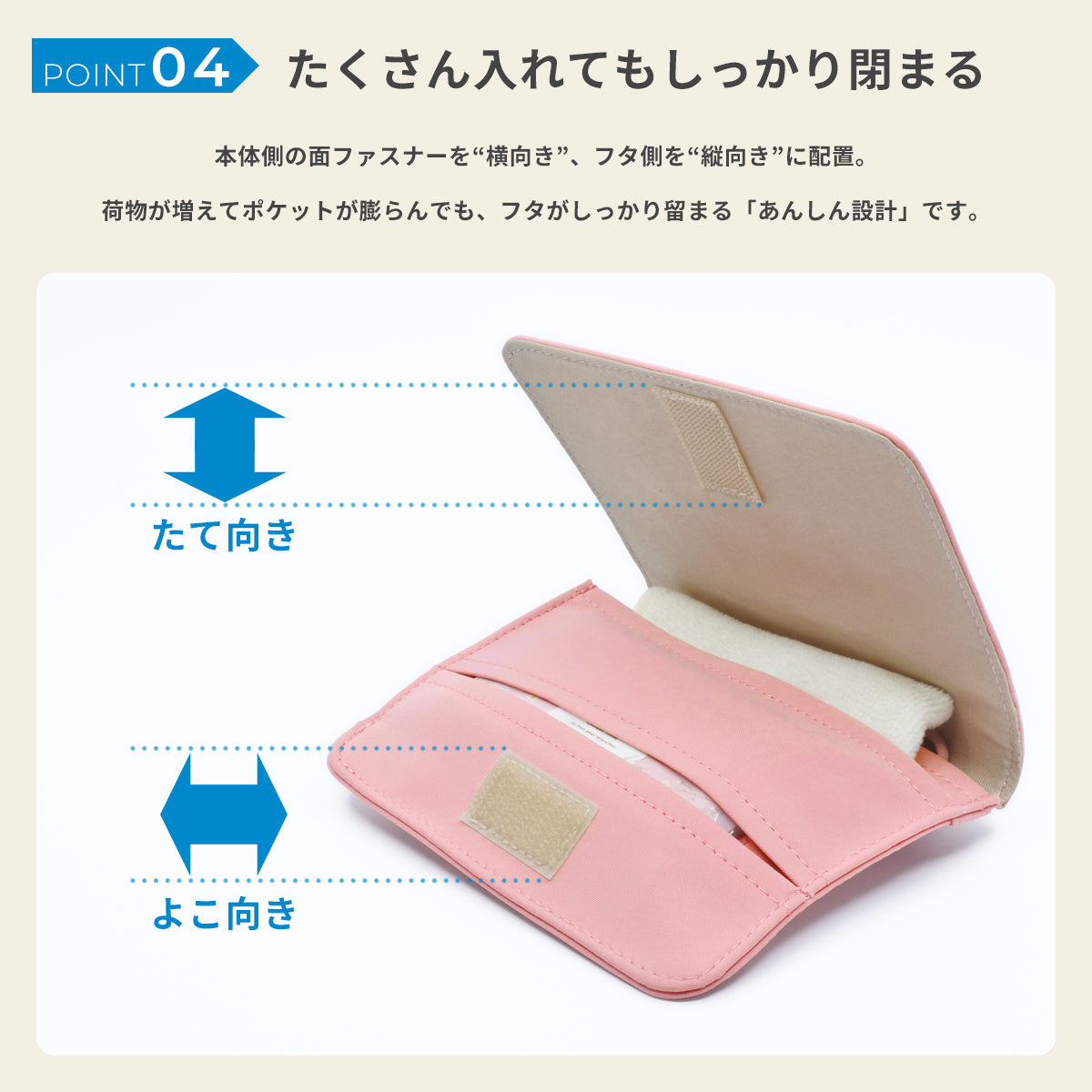 本体側の面ファスナーを“横向き”、フタ側を“縦向き”に配置。