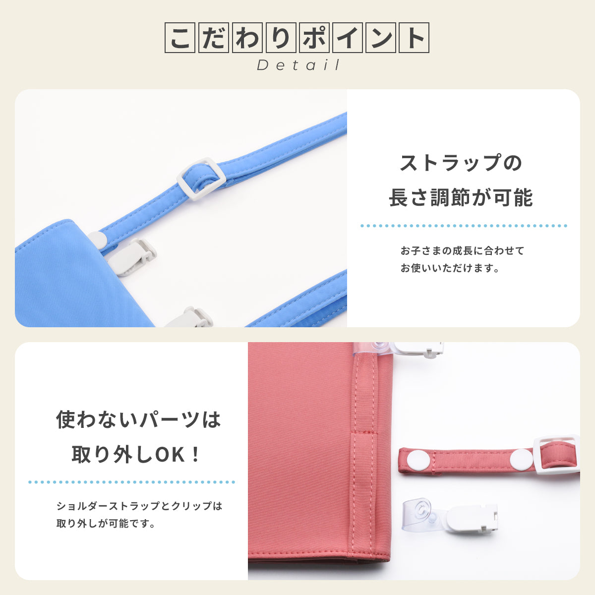 ● こだわりポイント ・ストラップの長さ調節が可能。お子さまの成長に合わせてお使いいただけます。